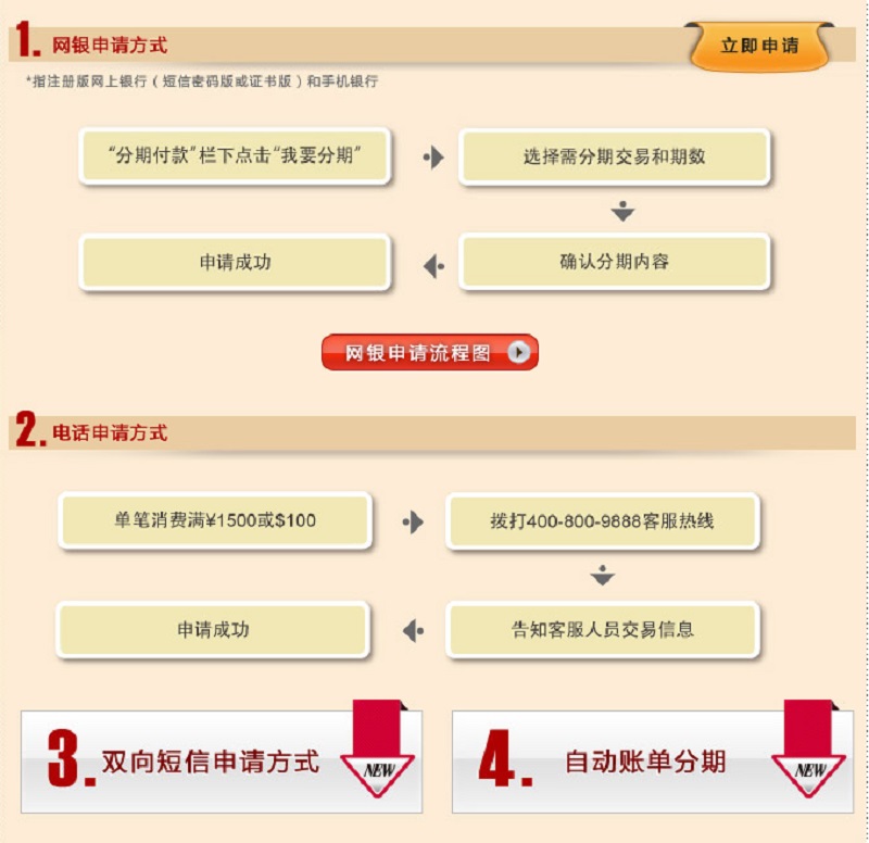 开办条件:分期付款业务的起始金额人民币/港币600元、美元/欧元100元。