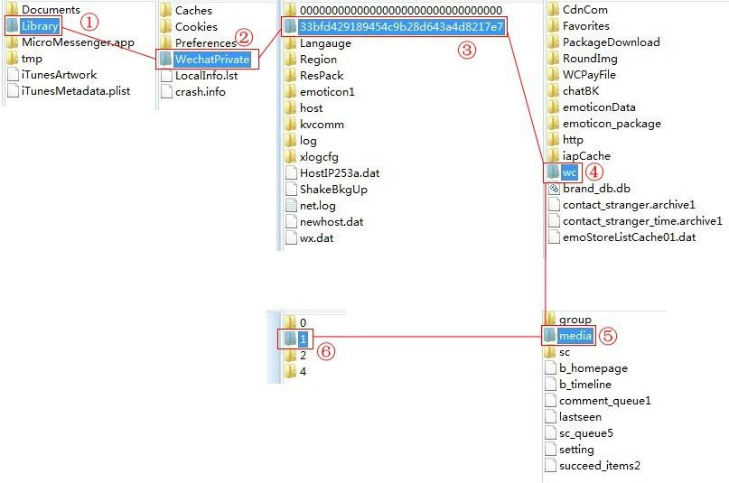 按照上图所示,进入Library-WechatPrivate-字符码文件夹-wc-media-1中删除所有缓存文件: