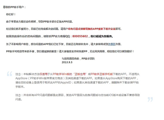 最近部分苹果用户反映,苹果产品安装的正版软件会出现闪退或弹窗导致软件无法正常使用,在经过技术部工程师测试发现,此问题和苹果设备本身无任何关系,由于安装的正版软件均来自PP助手,而最近苹果官方动作频频,导致PP助手部分正版软件出现闪退现象。好在PP官方及时发现了问题,并第一时间发布了公告给出了解决办法。