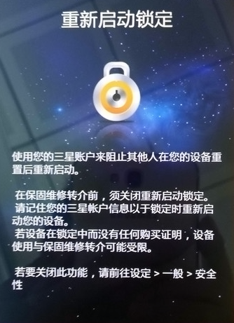 在三星最新发布的galaxy s note3上新增了一个“重新启动锁定”的功能(该功能与三星账户绑定);开启此功能机器刷机或者恢复出厂后会遇到无法正常进入系统,提示需要三星账户信息以解除锁定;对此望广大朋友谨记设置过的账户信息,机器恢复出厂或者送修刷机前请前往:设定 --- 一般 --- 安全性,取消“启用重新启动锁定”选项,此功能经测试无法刷机解决!