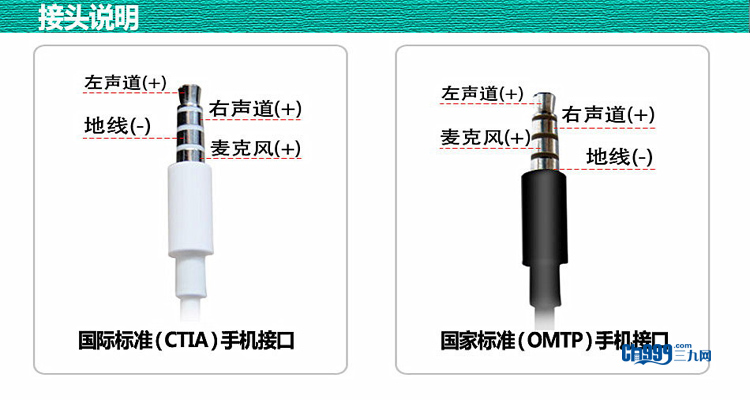 ②、国家标准(OMTP)的3.5毫米接口:插针接法是左声道-右声道-麦克风-地线。要适用手机范围:诺基亚、索尼爱立信(全系列)、中兴(全系列)、步步高(全系列)、酷派(全系列)、HTC 非官方产品(A3380、A3360、T9188、A9188、Z510D)、三星旧产品(i8910、M3510C、M7500、F278、F700、F408、F490、G810、G818、G818E、i550W、8510、i560、S8000C、i8000、M2710C、i7500U、i9000、i6500U、F809、i8000、F859)、摩托罗拉XT531、联想A520/A750/P700、OPPO(全系列)等国产系列手机。
