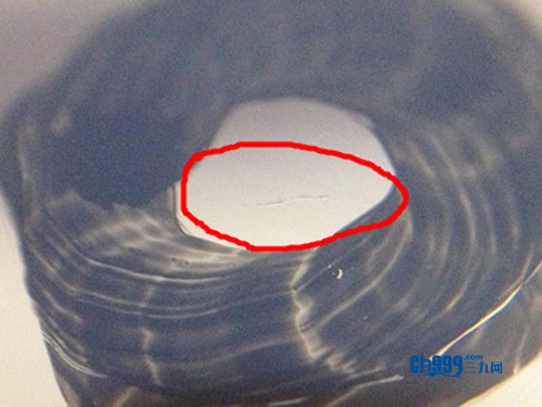 我们用微距的镜头拍摄这张照片,大家可以看到一条很明显的划痕