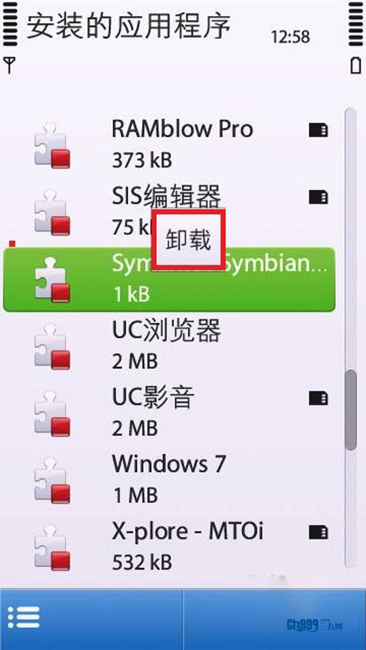 5、退出软件,进入设置-程序管理-已安装的程序,找到名为Symantec Symbian Hack的程序。长按出现卸载菜单,选择把他卸载。