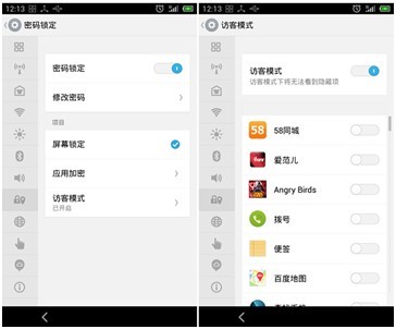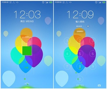 Flyme 3.0解锁方式和之前相同,一样是通过上划解锁,双击HOME键播放音乐。不过新增双击HOME键上划直接解锁到桌面功能。并且密码锁屏增加访客功能,自动隐藏程序,保护隐私。并且有拍照快捷功能键,不用输入密码即可使用。 图一: