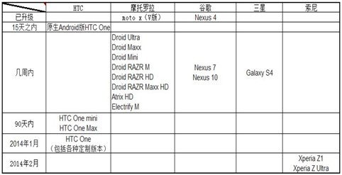 随着谷歌最新Android 4.4 KitKat操作系统的推出,各大手机厂商也纷纷推出了旗下机型的升级计划。外国媒体phonearena为我们汇总了各品牌即将升级Android 4.4系统的机型名单: