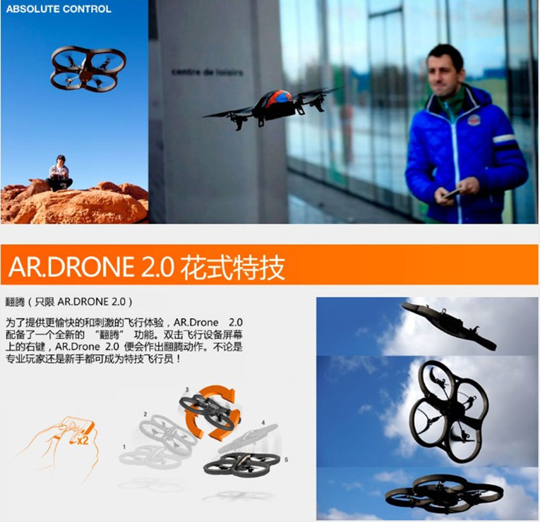 Drone 2.0是四桨遥控直升机,是大获成功的前代升级版本。不但保留了之前的iPhone无线遥控并远程同步视频功能,新加入了“桶滚飞行”模式,以及飞行中拍照和视频,储存于机身USB接口插入的U盘功能。
