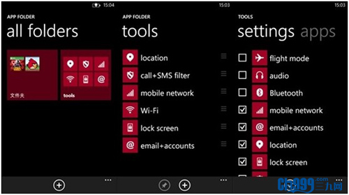 文件夹功能:虽然桌面文件夹功能早已出现在其他手机移动操作系统中,但是Windows Phone却一直缺少类似的功能,而现在App Folder应用文件夹终于弥补了这个空缺,它允许用户将很多不同的应用程序集成在一个动态磁贴当中,整个桌面看起来更为简洁有序。