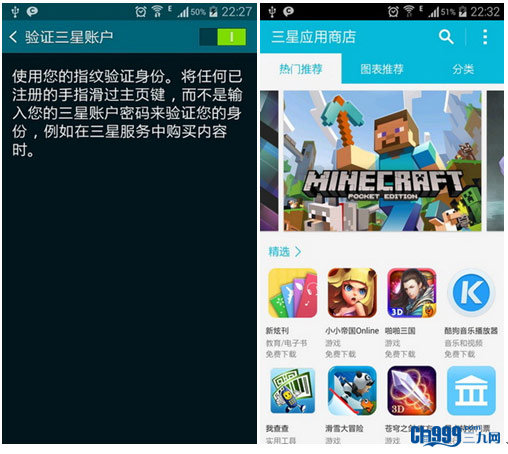 指纹识别除了用在解锁上,三星GALAXY S5还提供了另外一些应用程序的支持,例如在三星应用商店中,可以直接使用指纹登录绑定三星账户,在购买服务时免去输入繁杂的大串密码时间,更安全简化。