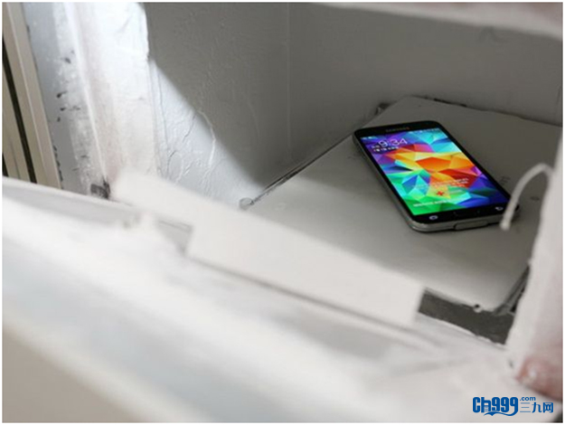Galaxy S5 是一款防水防尘手机,三星测试 Galaxy S5 的防尘功能。