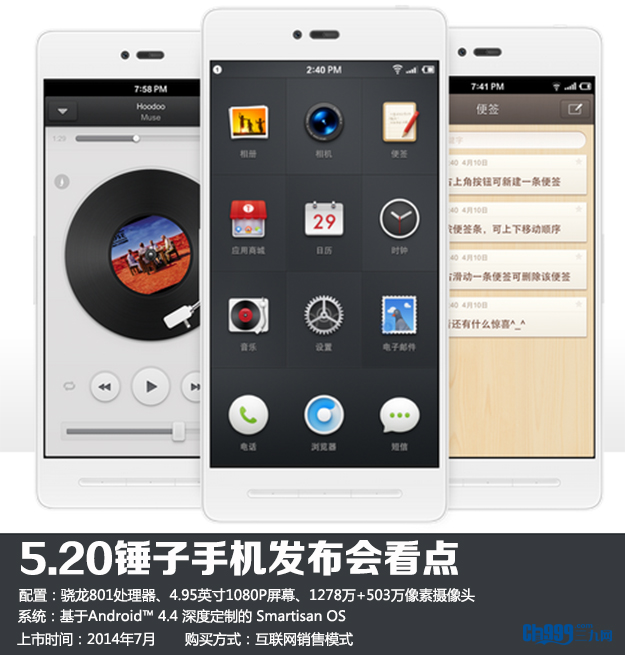 2014.5.20,谐音“爱你一世我爱你”,在这个特殊的日子里,虽然没有赶上春天的末班车,但在夏天到来的不久之后,锤子手机发布会还是来了。5.20下午19:30,锤子手机发布会在北京正式召开。小编与大家一同来回顾一下,有关锤子手机已经曝光的配置参数和价格等信息:
