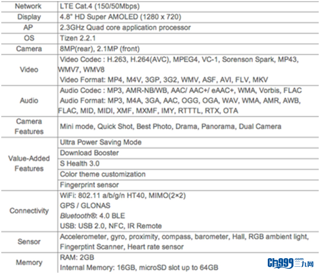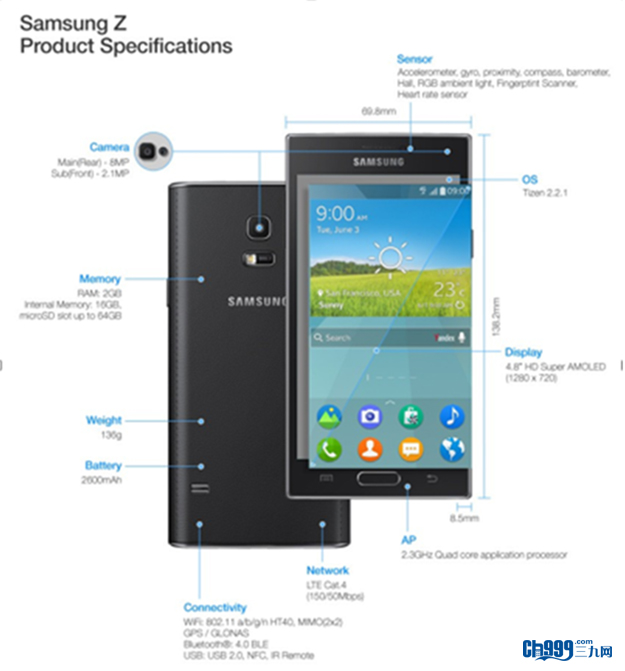 Samsung Z 硬件配置平平,搭载一块 4.8 英寸、分辨率为 1280×720 的显示屏;2.3GHz 四核处理器;800 万像素后置、210 万前置摄像头。2GB RAM 以及 16GB ROM。支持 4G、蓝牙 4.0、NFC。电池容量为 2600mAh。除此之外,Samsung 还为 Samsung Z 配备了指纹识别以及心率检测模块。