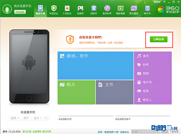 2、电脑上安装好360手机助手,打开360手机助手,点击立即连接;