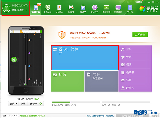 3、当360手机助手界面左上角出现,mibox等字样,说明连接成功,并选择游戏、软件选项;如下图