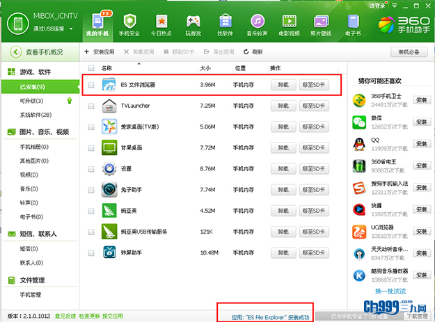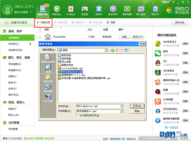 当然上面的泰捷视频软件也可以像安装ES文件浏览器一样,通过360手机助手直接安装。不过通过电脑安装时,您得保证您的设备各端口能正常工作,USB端口能被电脑端助手软件识别,而且您也得注意盒子在第一次打开时设置好软件安装的选项:设置中的开发者选项要打开,未知来源要打开,这样才能保证您正常安装第三方软件。不过,由于电脑系统与小米盒子系统存在兼容性问题也可能导致设备无法被电脑端软件识别,此时,建议您将连接线更换,或者重新连接另一台电脑尝试安装,或者将小米盒子在设置选项中恢复出厂设置后重新按照上述设置重新连接。若以上操作您都尝试了,盒子还是无法被电脑识别,建议您更换小米盒子。