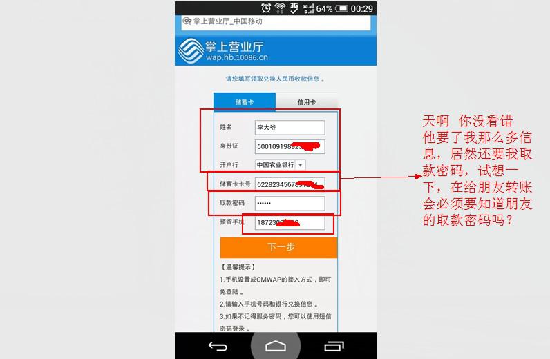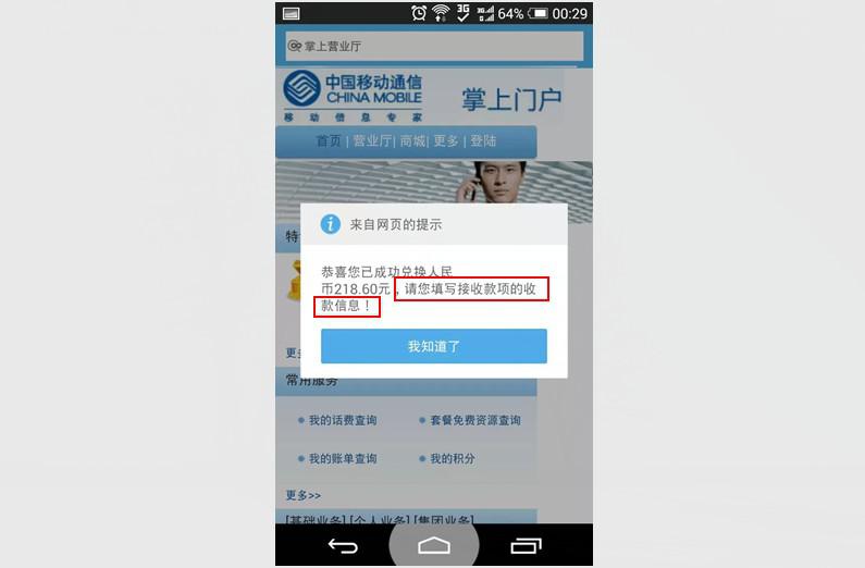 点击进去后页面做的也是很像移动官方的网站,根据提示填写相关信息后提示兑换成功,下一步需要我填写收款信息,依然继续。
