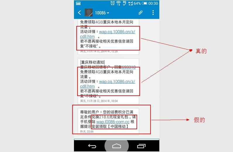 近期三九技术的软件工程师就收到了类似的诈骗信息,奇怪的是发送短信给我的号码竟然是中国移动通信官方客服号码10086发来的,一看还以为是真的,到了最后才发现觉得不对劲。事情是这样的:收到10086的短信提示我积分已经满足兑换218.6元现金的条件,后面要求我登录域名为:wap.10086-com.cc的页面根据页面提示安装他的一个软件后领取(注意移动官网为:www.10086.com或者www.chinamobile.com,以及WAP页面为wap.+当地地区代码.10086.cn)。