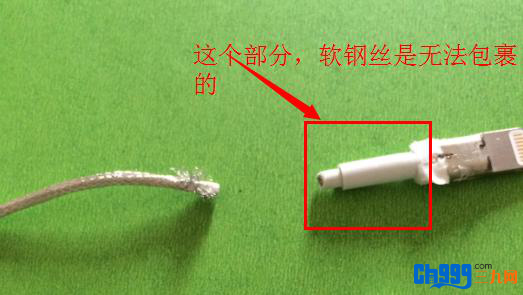 但是,问题恰恰就出在这里,由于数据线内部采用软钢丝包裹,但是接头的部分也就是导线与接头连接的部分,软钢丝无法包裹到这里。