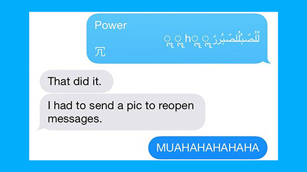 出现在iMessage的死亡代码又名“Effective Power”,iMessage用户在收到一串阿拉伯字符的时候就非常有可能崩溃,因为这个代码可以使得iPhone内存负荷超载,并引起崩溃。苹果已经意识到了由一系列代码字符引起的iMessage问题,我们将会在日后的软件更新中修复。在更新到来之前,你可以使用下列步骤来重新打开信息应用。”
