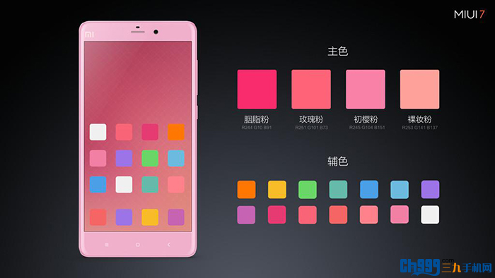 第一套系统UI:MIUI女神版,女神版挑选了4种很漂亮的粉色作为设计主色调:胭脂粉,玫瑰粉,初樱粉,裸妆粉,再根据与主色搭配的色调,选择了一系列的辅色,配合女神气质,重新设计系统图标,还借鉴了女生裙褶的设计元素,设计了女神版的锁屏壁纸以及各种图标,使之看起来更美。