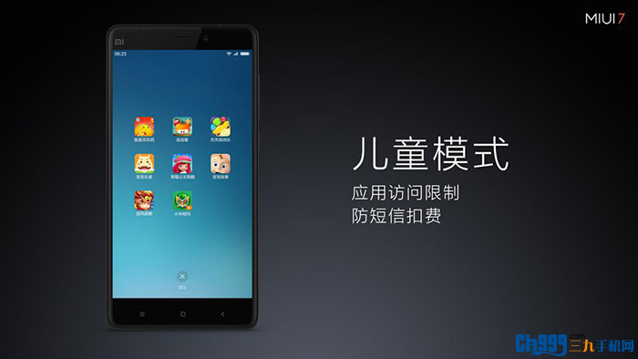 MIUI7为年轻父母专门打造的个性功能:儿童模式,MIUI 7儿童模式设置了应用访问限制和防短信扣费,不会乱动原布局,也能避免误触扣费。