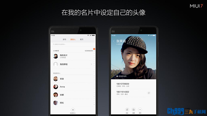 MIUI 7还为年轻用户群体打造了:来电秀,可以在联系人“我的名片”中设定自己的头像,这时就会自动同步到你的手机好友联系人中。