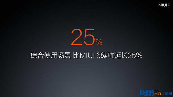 在性能方面,MIUI 7优化了APP应用的启动过程,加载数据与动画展现同步进行,缩短桌面响应时间;同时MIUI 7也对CPU的调度进行了优化,号称系统响应速度提升20%。MIUI 7针对市面上的500多款应用程序进行了单独的省电策略,相比MIUI6,号称可以将续航延长25%。