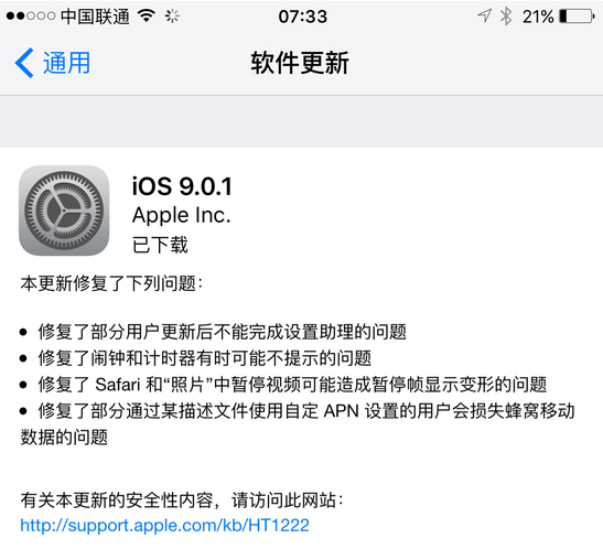 9月17日,苹果发布了iOS 9正式版固件更新,iOS 9虽然带来诸多新功能,但不少用户更新到iOS 9后却出现了卡顿,耗电等问题,总之,不是那么流畅, 甚至有用户调侃“iOS 9更新后修复了iPhone 6/Plus过于流畅的Bug”。一波未平一波又起,近期又爆出了Xcode 病毒事件,于是,iOS 9正式版推出仅一周多的时间后,今日凌晨苹果就推出了iOS 9.0.1版本更新。