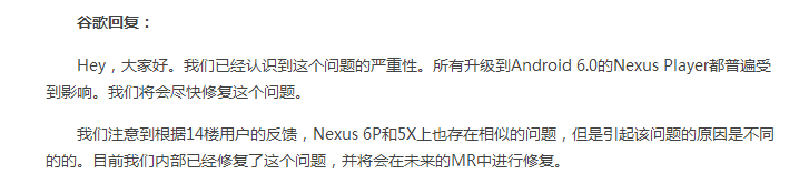而近期一条Android 6.0会导致谷歌Nexus设备视频播放出现问题的信息在网络疯狂流传,就连最新旗舰Nexus 6P和Nexus 5X也未能幸免。现在谷歌已经承认Nexus Player/Nexus 5X/Nexus 6P设备在升级Android 6.0 Marshmallow系统之后存在“水洗色”BUG——当设备开始播放一段视频的时候(无论是Netflix、Cast、还是Archos),黑色竟然会逐渐褪色变灰。奇怪的是,这种情况只会在播放视频的时候被注意到。就连自己的“亲儿子”都会出现此类问题,相信其他设备也可能存在此问题,下面是一则来自google官方的回复: