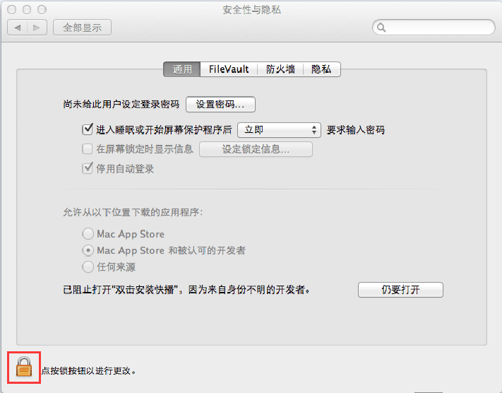 4、点击上图中红色方框内的‘锁’,系统会提示输入管理员密码,在输入密码之后我们就可以操作允许安装的来源,如下图所示。