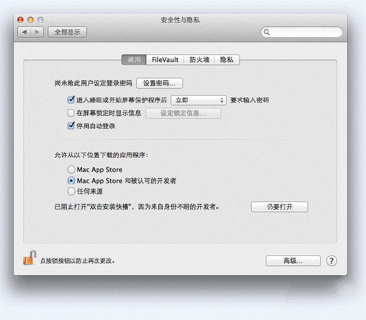 3、打开安全性与隐私-找到-通用,这里我们可以看到应用程序安装来源默认都是限制只能从AppleStore下载安装,且无法修改安装来源。