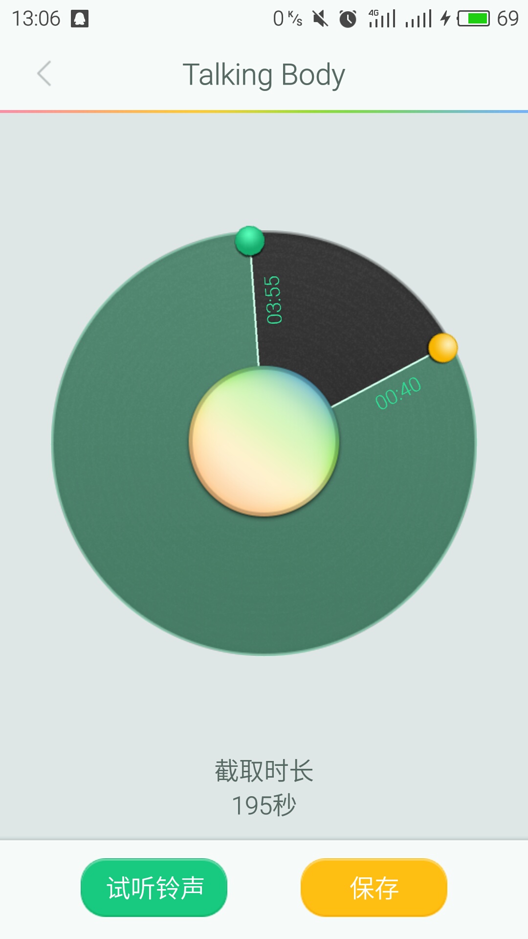 7、拖动转盘,调节好起始裁剪的位置,选择保存即可。(可以选择试听铃声以确定裁剪位置)