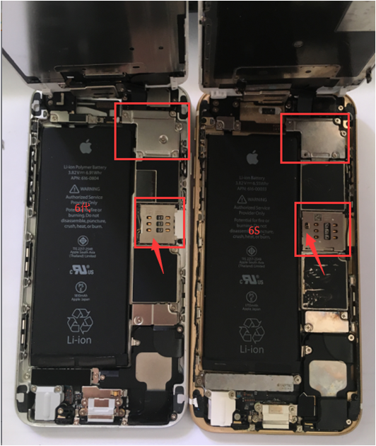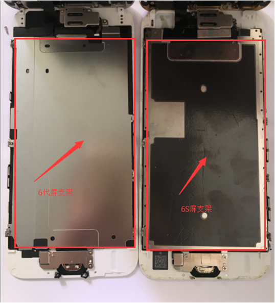 7. 有条件的可以拆开机子检测6代与6s的不同之处,从图片可以看出机器卡座位置、屏幕排线盖片和屏幕支架能直观的区分iPhone6和6s,图片如下: