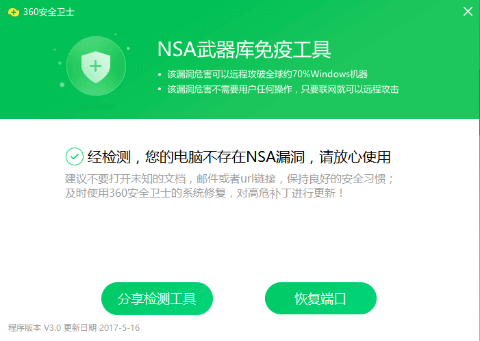 1、安装360NSA免疫工具查杀,使用NSA免疫工具可以封堵该漏洞,下载请访问dl.360safe.com/nsa/nsatool.exe