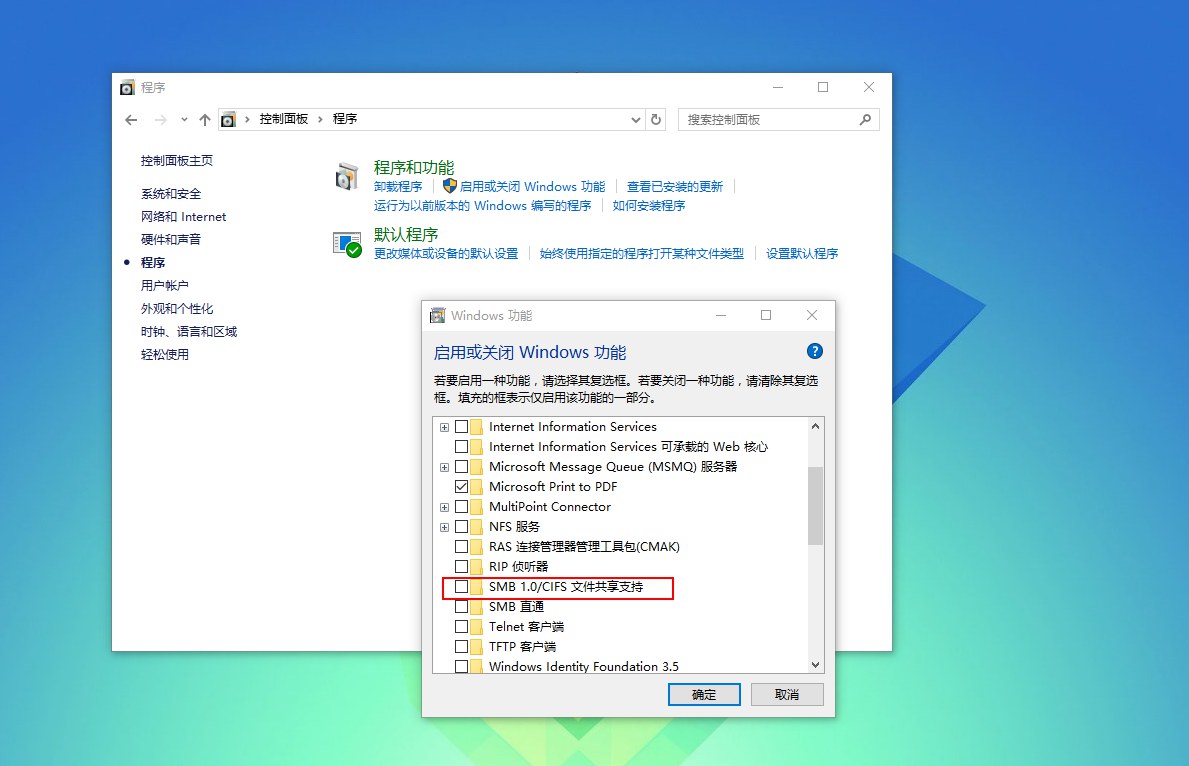 2、禁用 Windows的SMB v1共享功能,前往电脑的-控制面板-程序-找到“启用或关闭Windows功能”清除SMBv1文件共享支持的复选框,重启电脑即可。