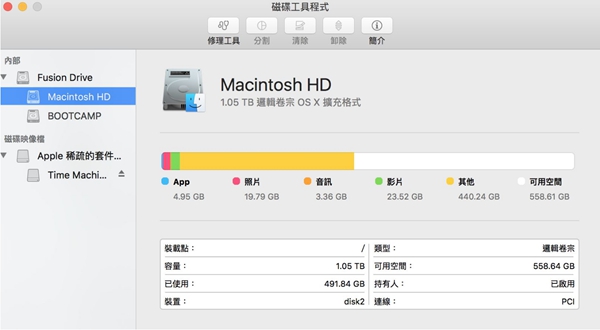 时下很多电脑都采用了混合硬盘的方式,一块儿小容量的硬盘做系统盘,或者做数据缓存空间,而搭配一块大容量机械硬盘来获得更多的数据存储空间。可以说,在固态硬盘成本依旧较高的今天,这种混合式的解决方案,无疑在机器运行速度与数据存储空间之间找到了平衡。而Fusion Drive与其不同,它涉及到OS X逻辑卷管理器Core Storage的虚拟化存储问题。Core Storage最早是在狮子版本中出现,它可以让操作系统把多个物理磁盘当做一个逻辑卷来对待。与传统固态硬盘缓存架构不同,Fusion Drive并非真正的缓存,它会根据访问频率和可用空间,在固态硬盘与机械硬盘之间智能的进行数据移动。一个Fusion Drive的容量,实际上是其组成部分的总和。从磁盘工具可以看到,它把Fusion Drive显示为一个硬盘,标签为Macintosh HD。并没有将固态硬盘与机械硬盘分离开来。