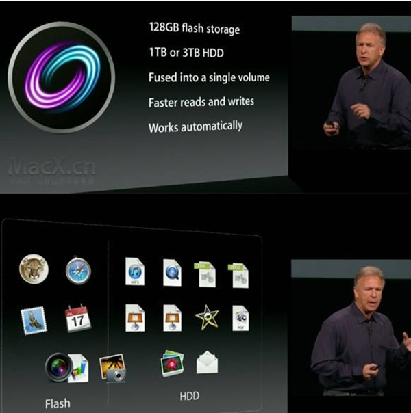 相对于纯机械硬盘而言 ,Fusion Drive启动速度有明显改善,大约快了40%。然而,Fusion Drive的性能依然不及纯SSD。不过Fusion Drive的机制,如果Photoshop是你最常用的应用程序的话,那么它会被智能化的完全移动到SSD上。启动速度与在纯SSD上就会相差不大。这也是Fusion Drive相对于普通混合型硬盘方案的最大优势所在。简单的归纳一下,Fusion Drive的原理就是一块SSD加一块HDD,通过系统的智能选择和整理,最大化的利用SSD的速度来提升系统效率,通俗的说是将常用的文件,软件等资料尽量的写入ssd运行,而不常用的文件会自动存放到HDD,这一切都是系统智能管理,不需要人工干预,所以在实际使用中,很多用户能够感觉Fusion Drive也不赖嘛,速度和SSD没啥区别。但是对于速度有完美要求,非常苛刻的朋友来说,是最理想的选择还是直接SSD。对于那些深度使用的用户,有大量数据需要进行交换,写入,读出,也建议用全SSD,如果只是普通用户,就是拿来上上网,做做简单的视频编辑,图片编辑,看看视频等,选择Fusion Drive也是不错的选择。