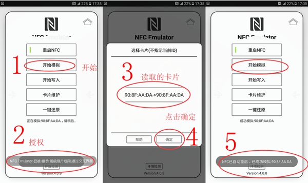 3、 点击开始模拟,弹出授权点击允许,将IC卡靠近手机的NFC芯片感应区,直到提示模拟成功即可使用。