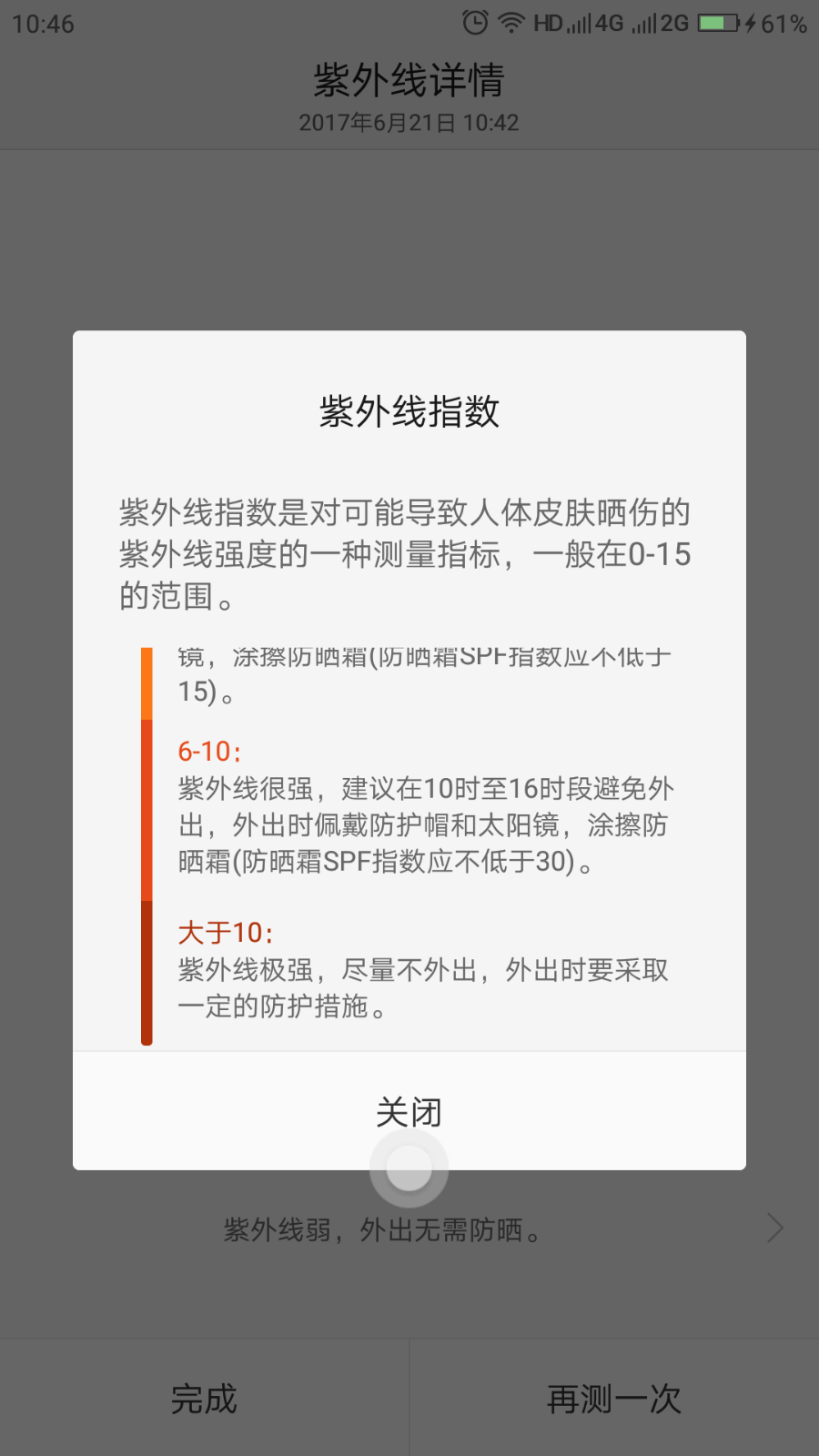 4、检测完成以后会显示紫外线详情和紫外线强弱,可以看到外出是否需要防晒,点击【>】可以查看紫外线指数变化范围对人体皮肤的可能损伤程度。