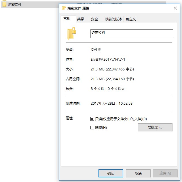 3、勾选隐藏选项文件夹就可以隐藏,但是点击“高级”可以进入高级属性对文件进行加密:
