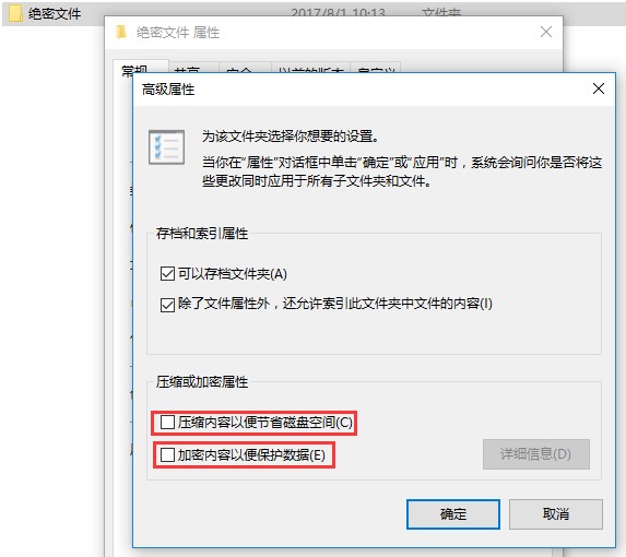 4、在高级属性中我们看到压缩或加密属性有两个选项,第一个选项是在加密文件的对文件进行压缩,第二项是对文件进行加密。(注:这个加密并不是设置一个密码进行锁定文件,只是加密以后只能允许在本台电脑打开此文件,如果你将文件拷贝到其他电脑是无法打开的,防止其他偷拷你的文件。)