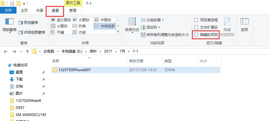 6、估计就有用户问了如果自己需要查看隐藏的文件夹怎么办?那我们可以在顶部工具栏点击查看,会弹出查看的菜单,我们可以看到隐藏的项目这个选项。