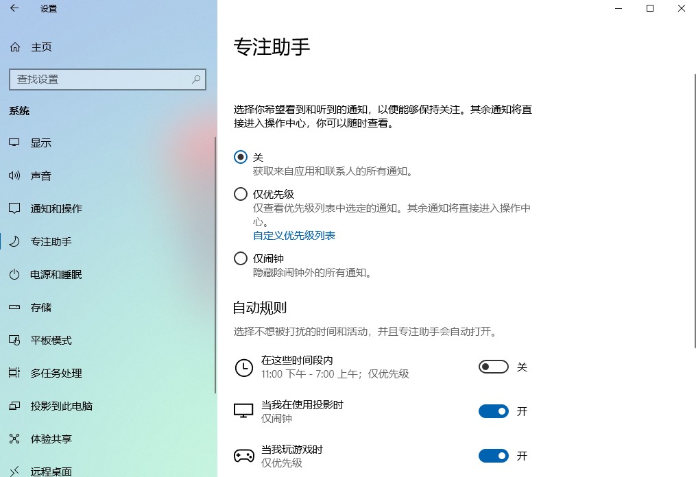 3、专注助手。这个功能与手机的免打扰模式类似,可以避免一些不重要的通知打扰到您的创意工作或者游戏娱乐,开启此功能后所有的通知将收纳到通知中心您可以稍后再查看处理。