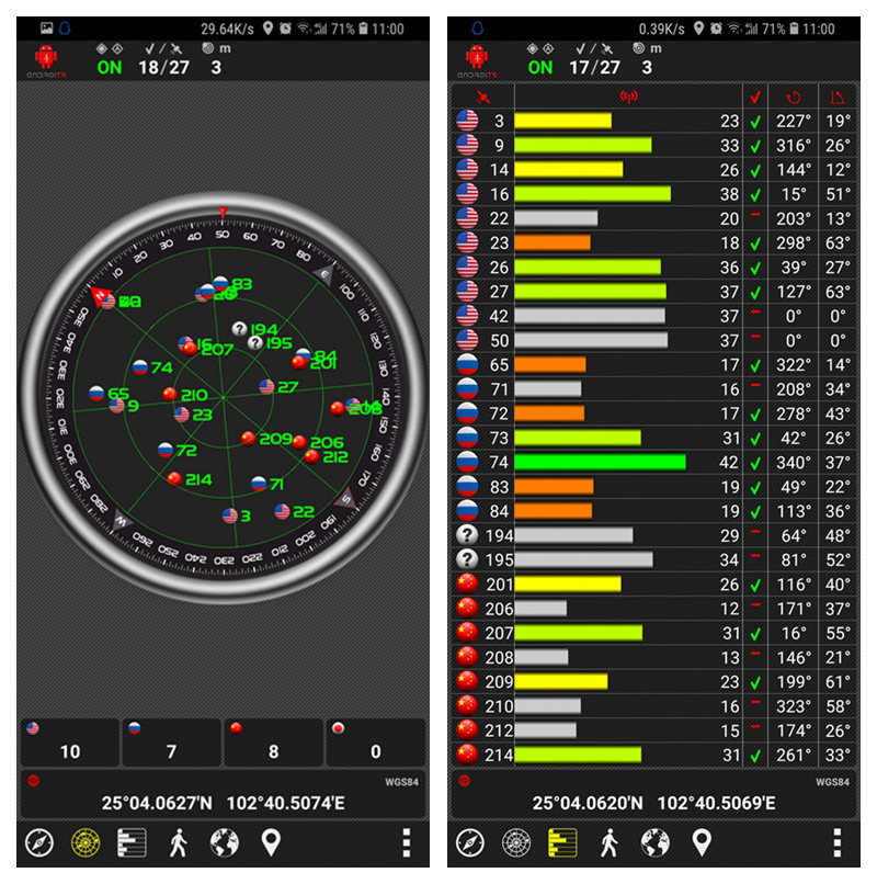 安装后打开App并开启手机卫星定位功能,从下图可以看到手机采用了哪些定位系统。