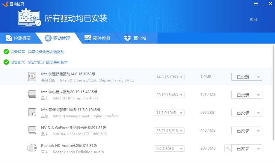 2、如果你的SSD硬盘安装默认驱动后出现上述故障,那么就可以借助驱动精灵来手动安装自己主板芯片组的官方驱动。启动驱动精灵后切换到“驱动管理”,比如英特尔芯片组用户会提示安装“Intel芯片组快速存储驱动”,这个驱动包含所需的AHCI。