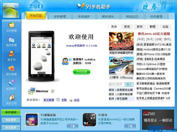 2、连接识别手机:用数据线将手机和计算机相连接,打开91手机助手,此时计算机屏幕会提示安装连接驱动,确认安装后91手机助手会自动下载安装驱动程序。