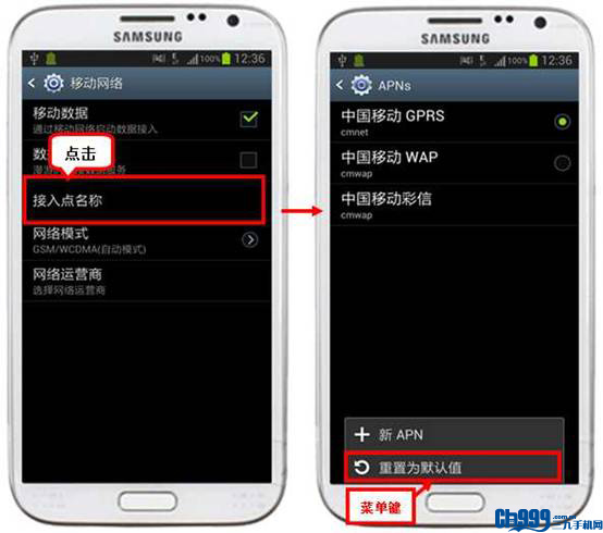 有客户反映Note 2上不了网,不知道该怎么办。如果用户的此款三星GALAXY Note 2 N7100手机不能用移动数据上网,建议用户按照以下步骤操作: